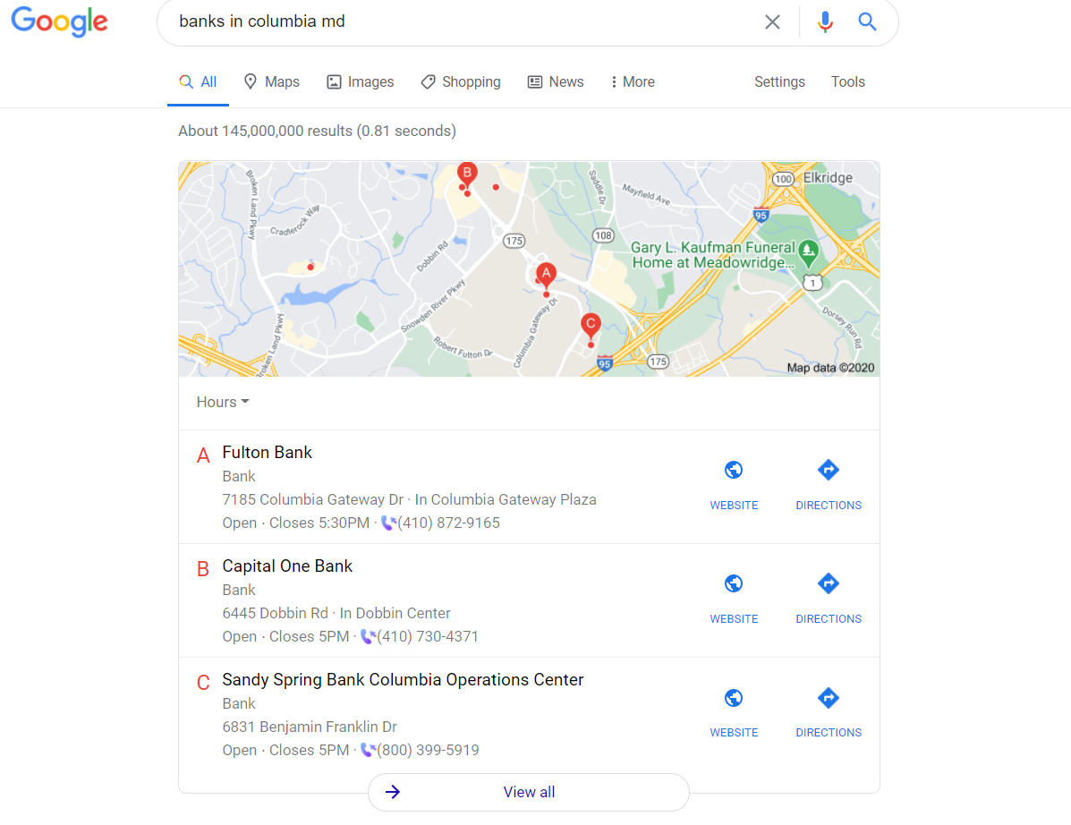 Take a look at the Google search provided below. Most of the results are banks local to the Columbia Maryland area. These banks organically rank in a Google search for banks near me because they have features such as: location pages on their website, update their Google My Business listing, and an accurate schema markup.